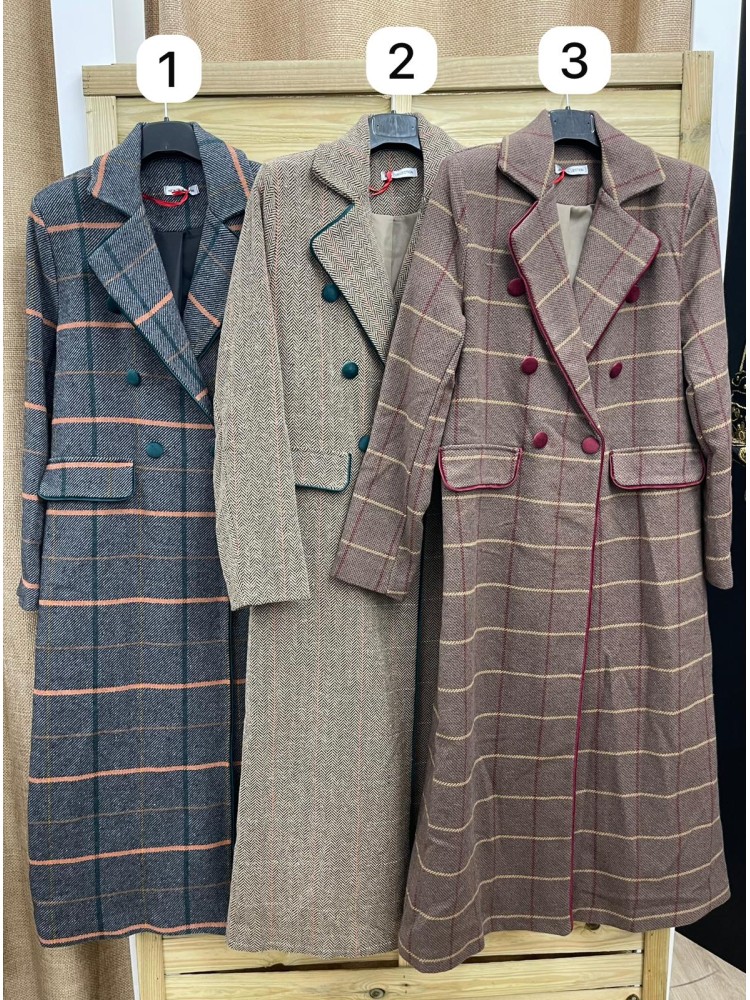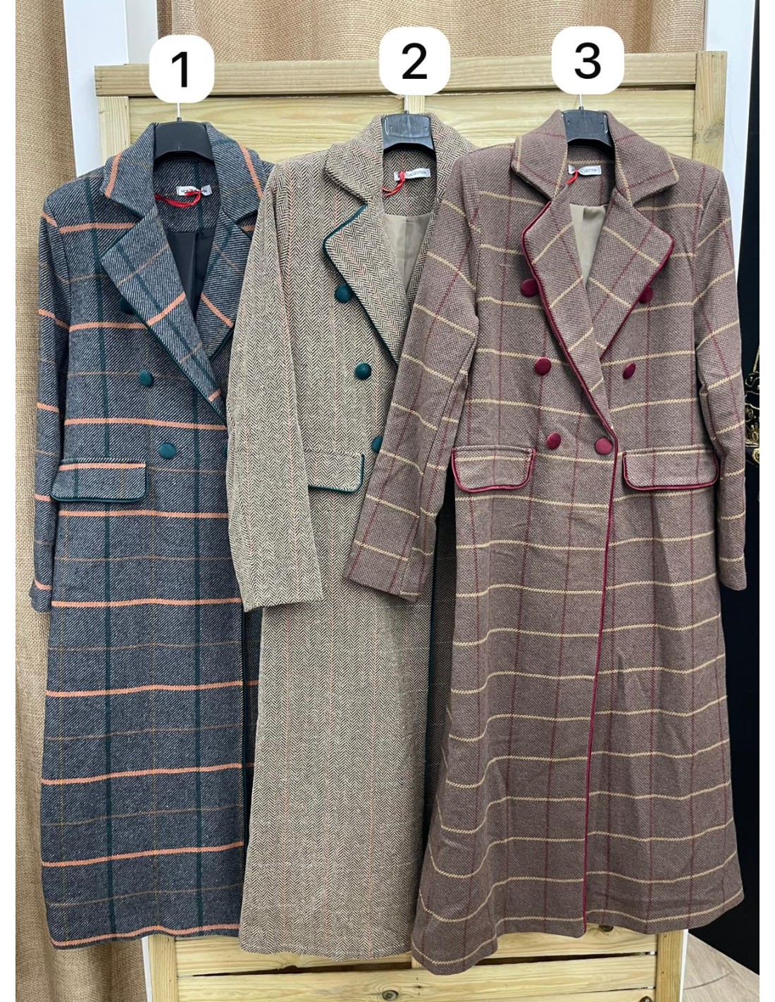 Abrigo largo de cuadros con vivo y botones de terciopelo