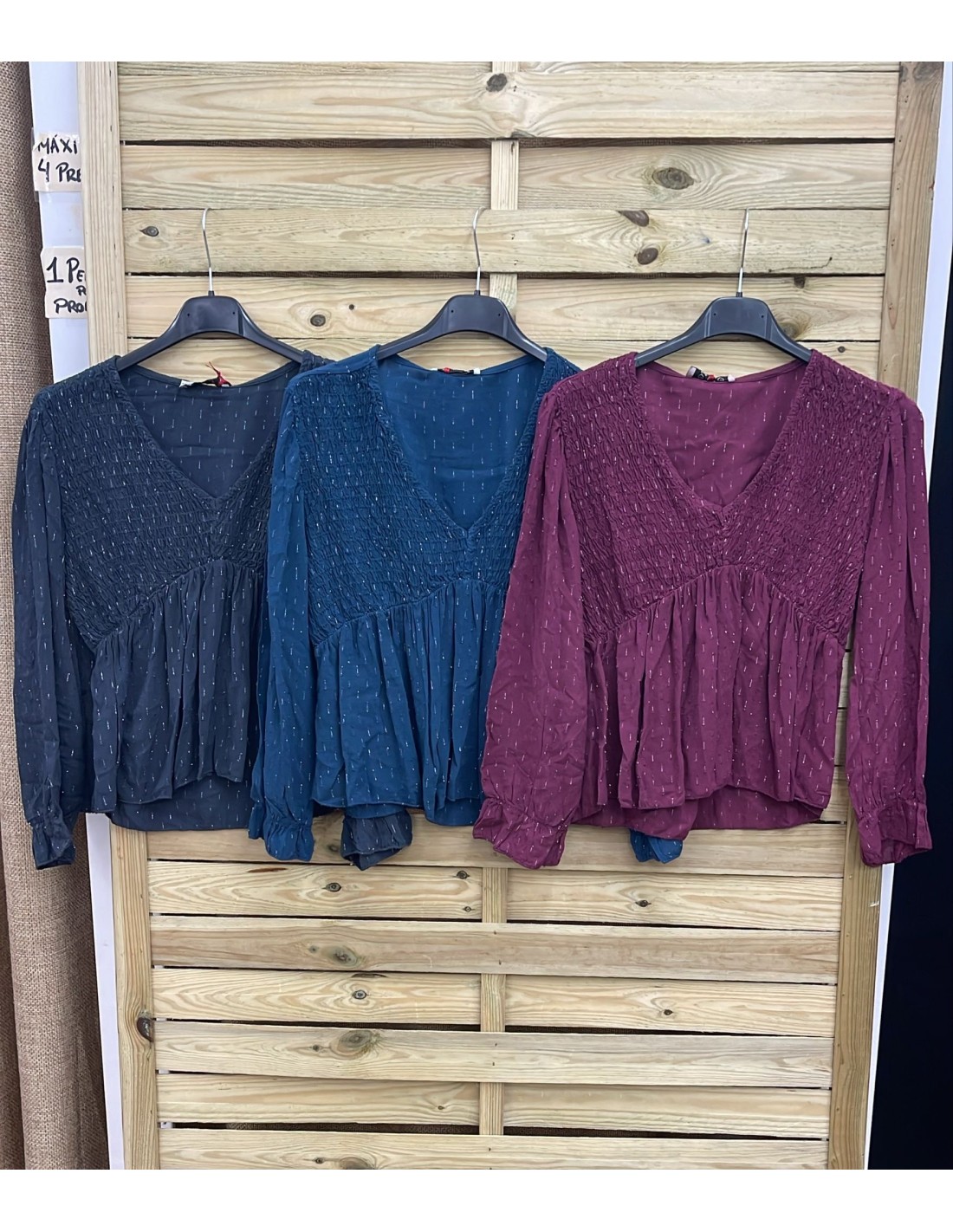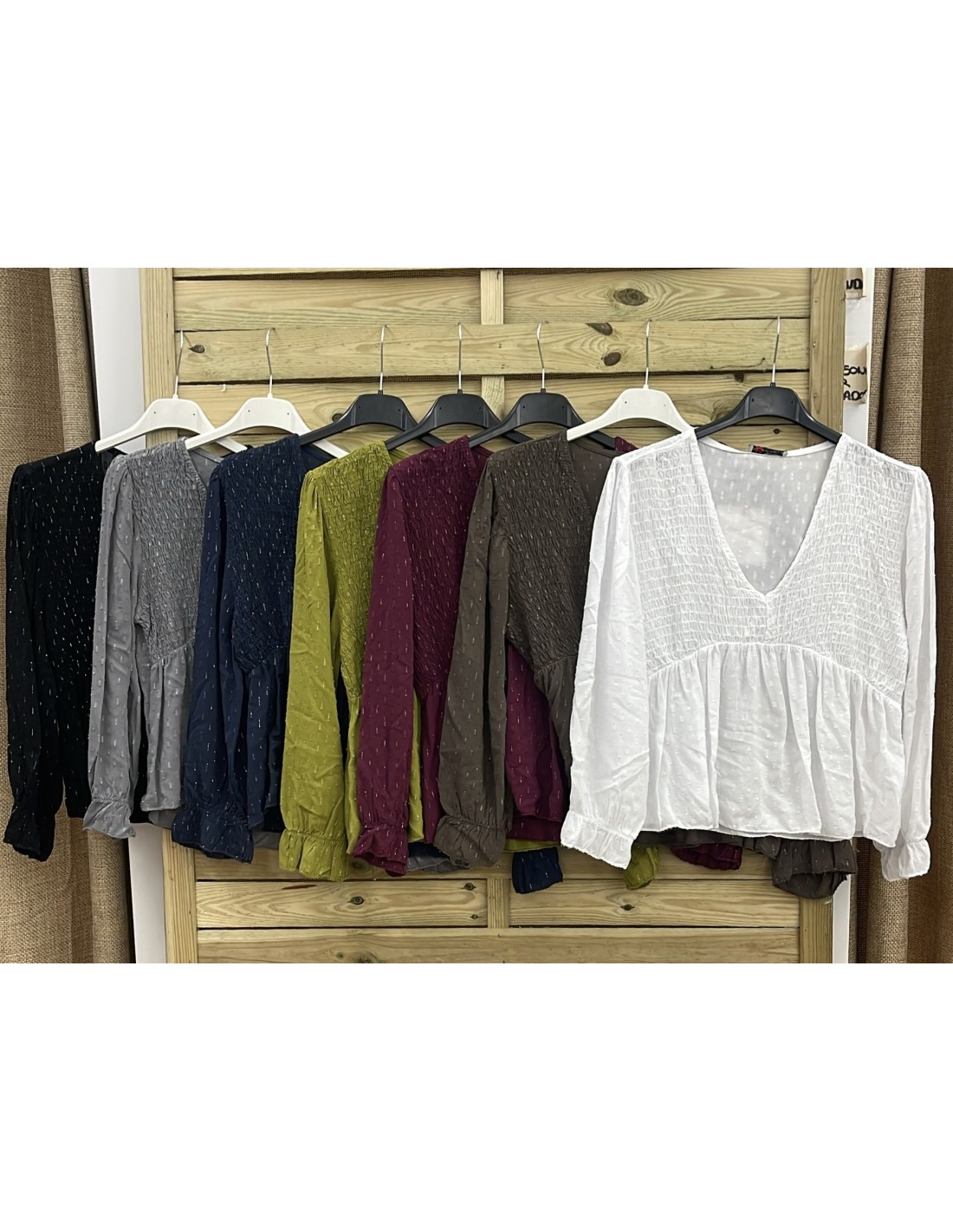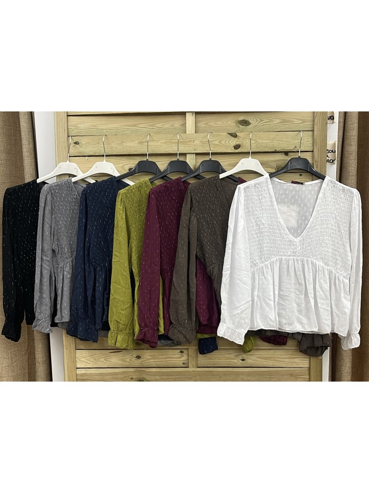 Camisa pico pecho fruncido hilitos plata