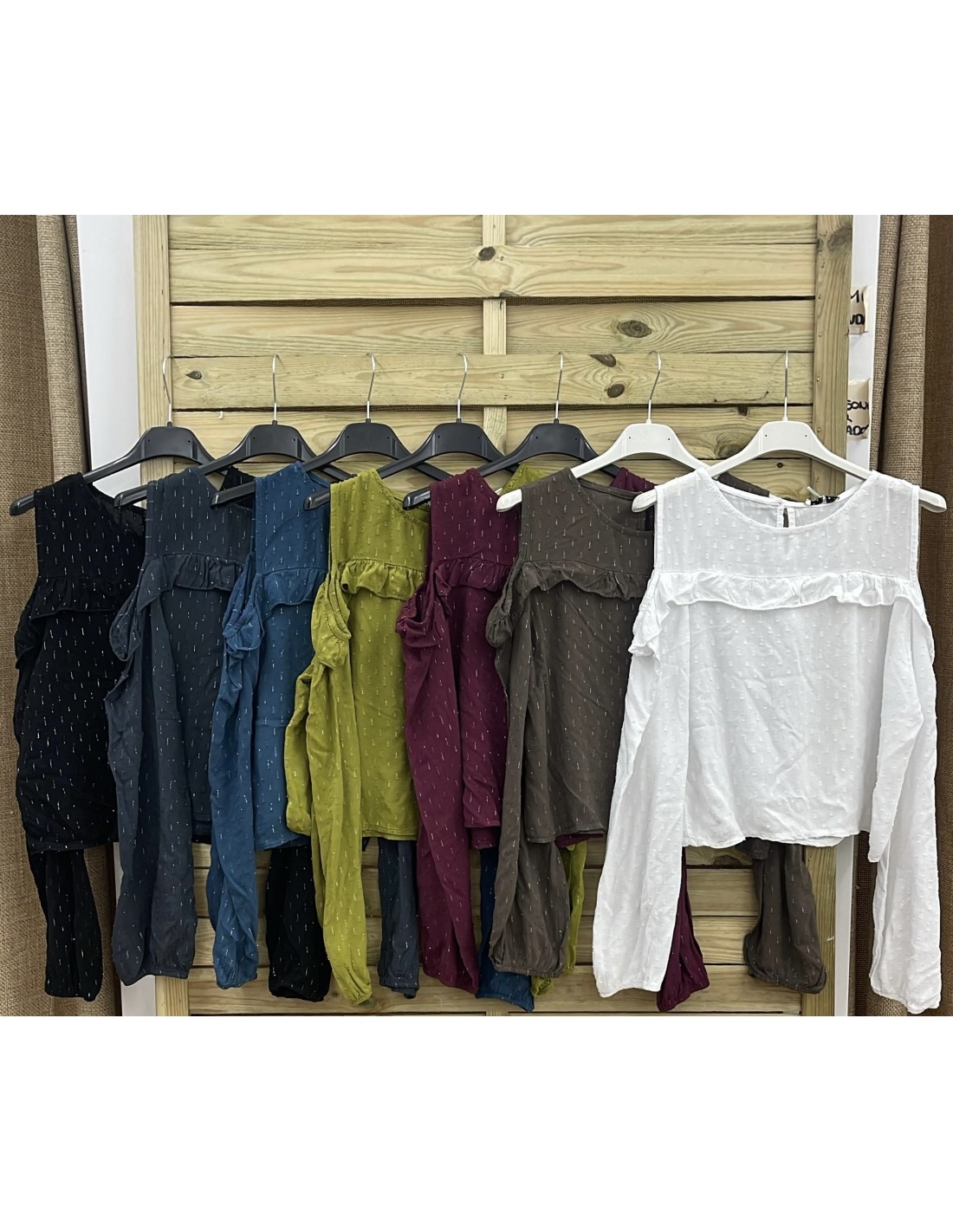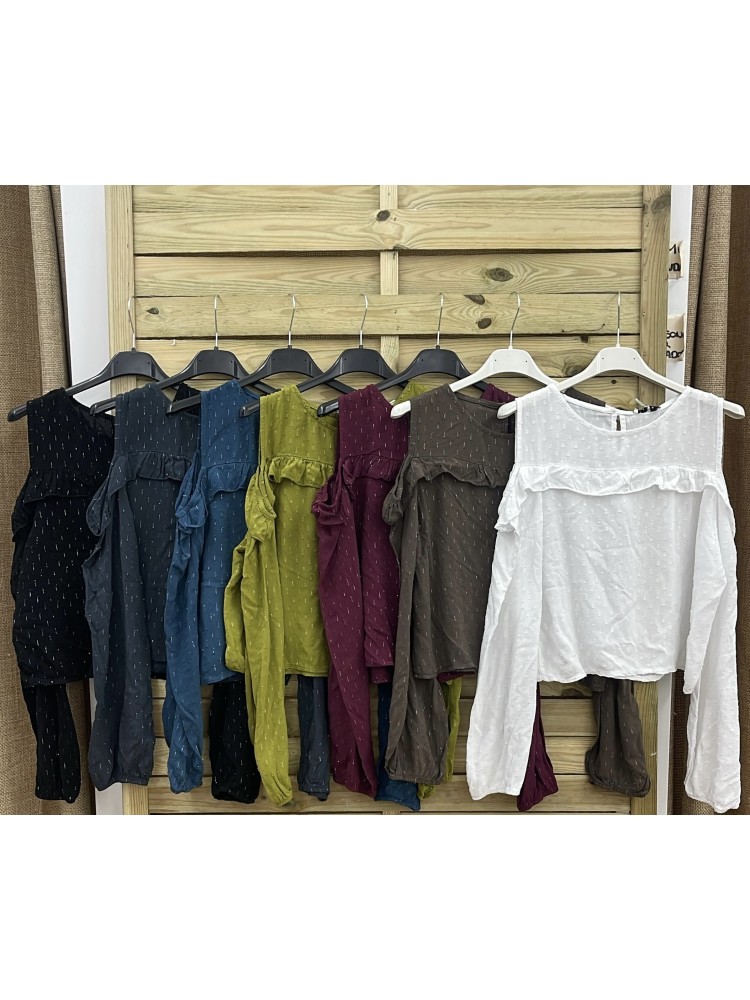 Camisa hilitos plata con hombros descubiertos y volantito horizontal
