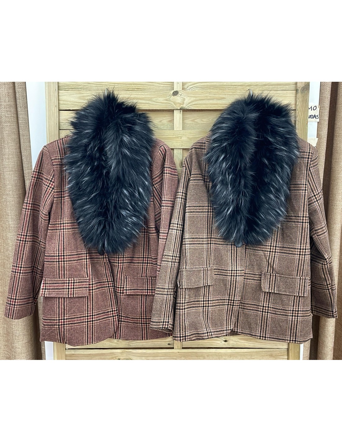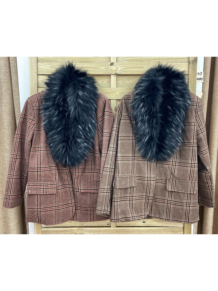 Chaqueta de cuadros con cuello de pelo
