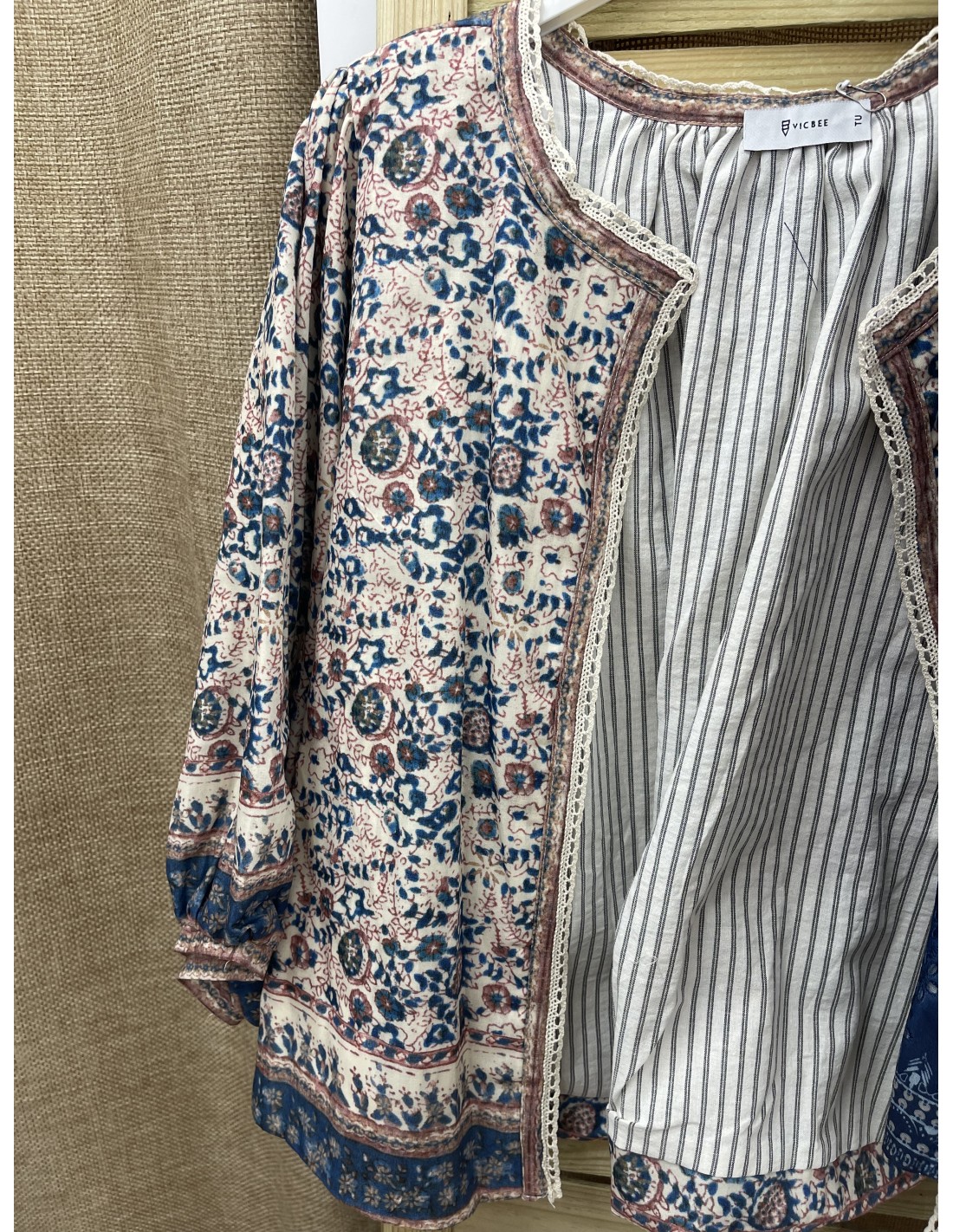 Chaqueta florecitas con forro de rayas y vivo mini encaje