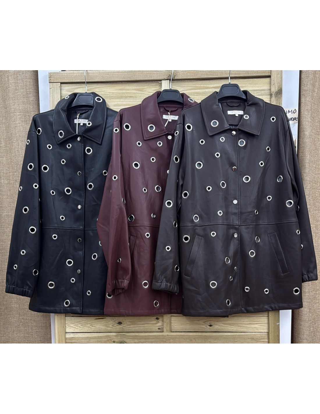 Chaqueta midi polipiel arandelas