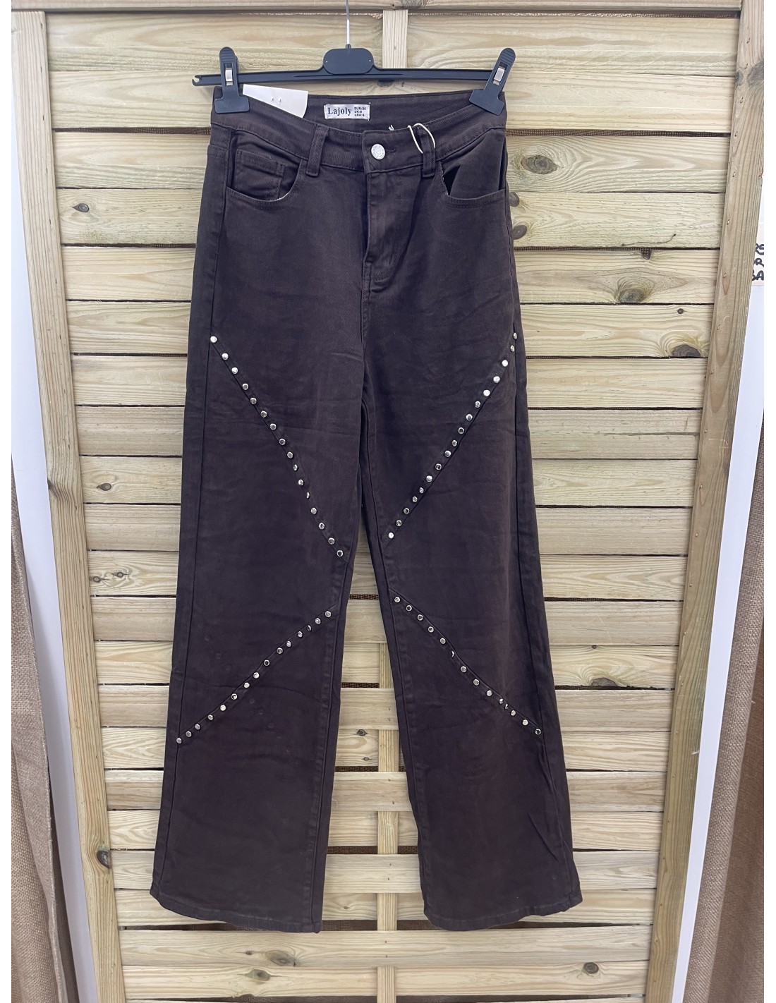 3. Jeans recto marrón con tachas planas en diagonal