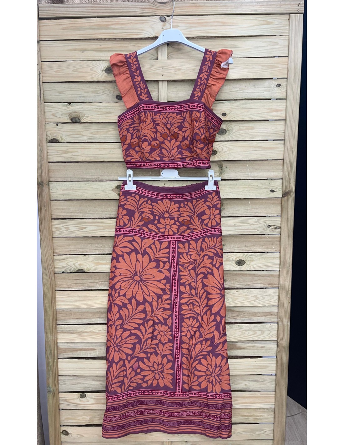 Conjunto floral de top corto volantito en sisa y falda