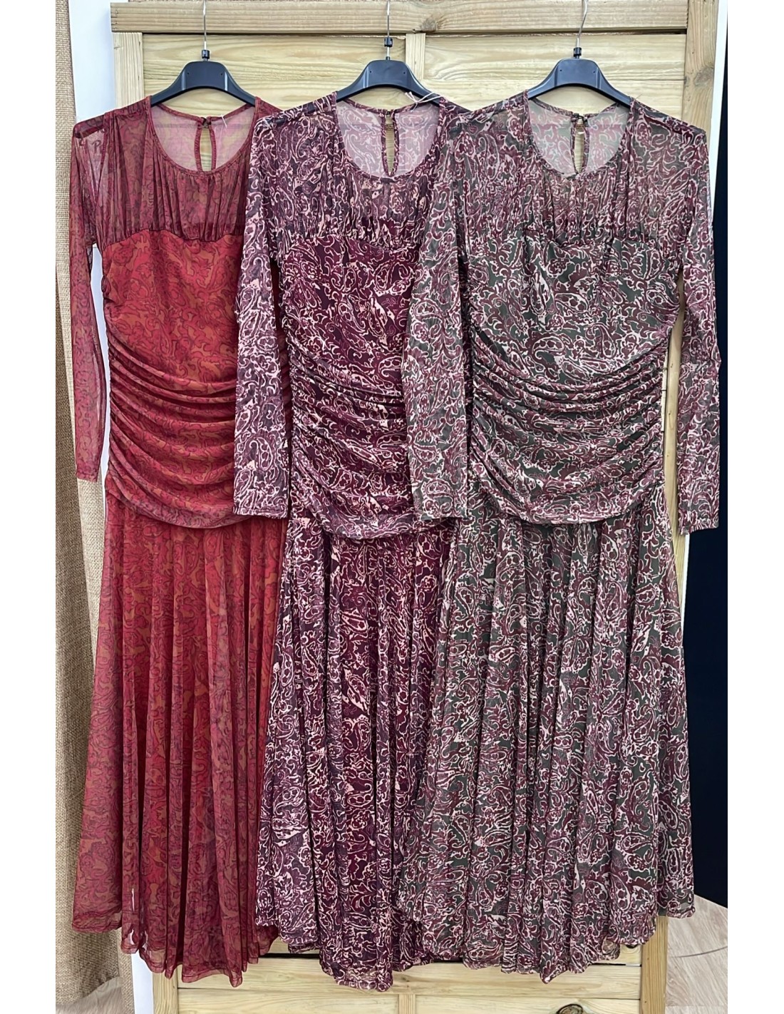 Vestido estampado tul con transparencia en escote y frunce en cintura